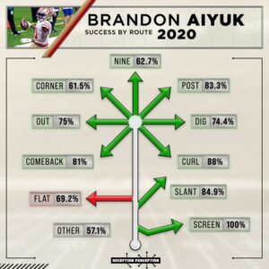 For starters – Brandon Aiyuk is an elite athlete. He runs a 4.50 40, has a 40” vertical (!!), & checks in with a 92nd percentile burst score.