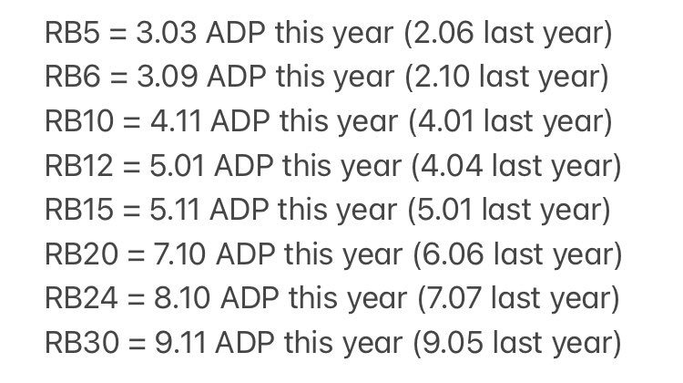 Basically every tier of RB is being drafted at least half a round later than they were last year – some MORE THAN A FULL ROUND LATER.