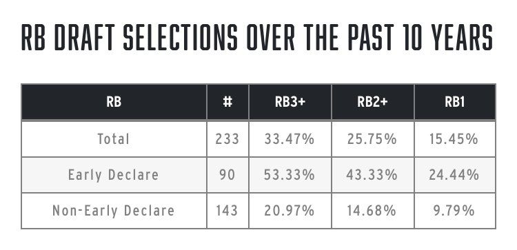 Roughly 25% of early-declare RB’s produce at least one RB1 finish.