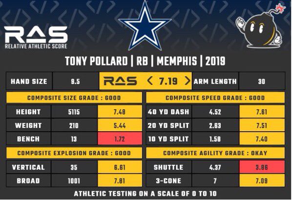 Bigbsy didn’t test as an *elite* athlete at the combine, but he weighed in at 6’0”/210 (big enough to handle a 3-down workload), & ended up with a “solid” overall RAS score (8.33/10).